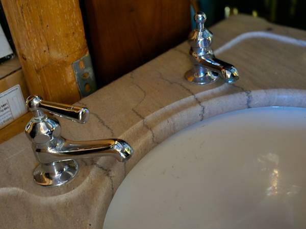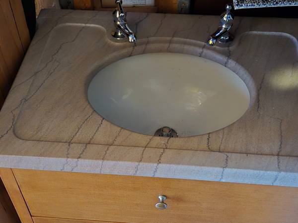 One of a kind stone sink with no cracks, chips or blemishes with period "Crane" faucets. Custom made maple cabinet with soft close drawers and doors. The cost to make a stone sink like this new would be 5 times the price.