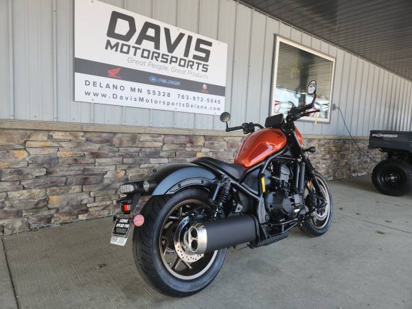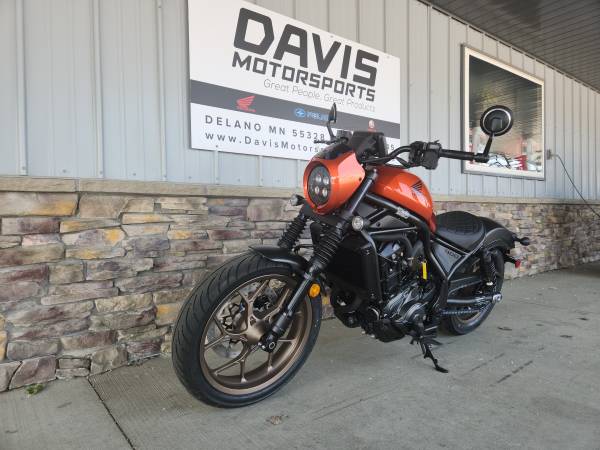 GET YOUR NEW 2025 HONDA REBEL 1100 SPECIAL EDITION WITH DCT AUTOMATIC TRANSMISSION FOR ONLY $ 10,349.00 NOW AT DAVIS MOTORSPORTS IN DELANO. NO FREIGHT OR SET UP CHARGES!! YOU SAVE $ 1,500.00!! This is a new model and color for 2025!! MSRP on this bike, model #CMX1100D3 is $ 11,099.00 + $ 775.00 freight. Check out the all-new Rebel 1100 SE, with tasty upgrades like a headlight cowl, bar-end mirrors, short front fender, custom seat, and an awesome Flare Orange Metallic paint scheme. Other updates for 2025 include a bigger instrument screen, Honda RoadSync, more comfortable seats, a more convenient USB port and more. This bike redefines the modern cruiser with its powerful parallel-twin engine that offers ample torque at any RPM. It combines easy cruising with unmatched revving capability, setting a standard in its class. The throttle-by-wire system expands the bike's versatility. You get four levels of Honda Selectable Torque Control and multiple power delivery modes, including Standard, Rain, Sport, and a fourth customizable option. Honda's revolutionary automatic DCT gearbox offers the best of both worlds: steel gears for durability and the choice between automatic or manual mode with paddle shifters. It provides a worry-free experience during relaxed cruising or stop-and-go traffic. The Honda advanced Anti-Lock Braking System (ABS) helps ensure your safety and control, whether you're navigating urban streets, riding in wet conditions, or exploring unfamiliar roads. With a bike like this, you'll want to get out on the open road. That's why we've equipped it with cruise control, letting you connect with the bike and the world around you like never before. Honda's commitment to superior handling extends beyond aesthetics, and these bikes are prime examples of this, as we've given equal attention to both cornering abilities and stylish design. An impressively low seat height of 27.5 inches ensures most riders can firmly plant their feet on the ground. It makes for a comfortable ride, confident stops, and easy maneuverability in tight spaces. Additional foam makes the seat even more comfortable this year. LED lighting all around provides superior illumination with long life. Great finance options on approved credit. Price does not reflect applicable freight, tax, and license fees. All rebates to dealer. Get your new Honda at Davis Motorsports in Delano.or call us at 763.972.5045 if you have questions. harley davidson street glide road glide indian challenger chief dark horse pursuit scout bobber sportster iron