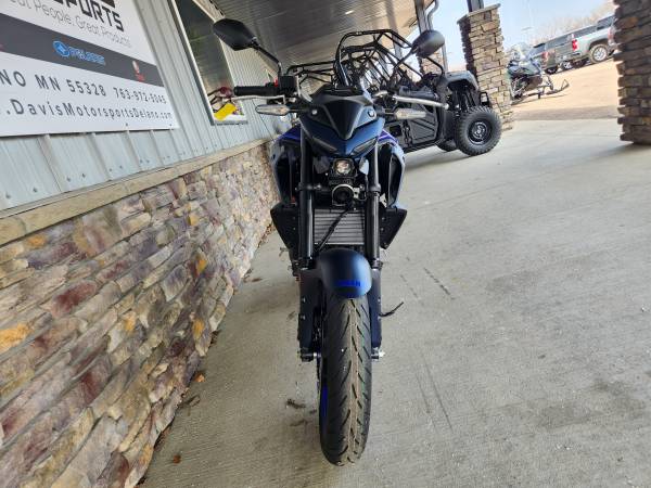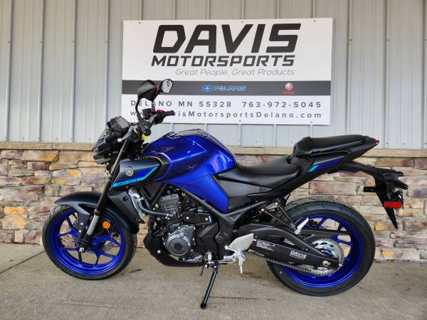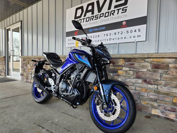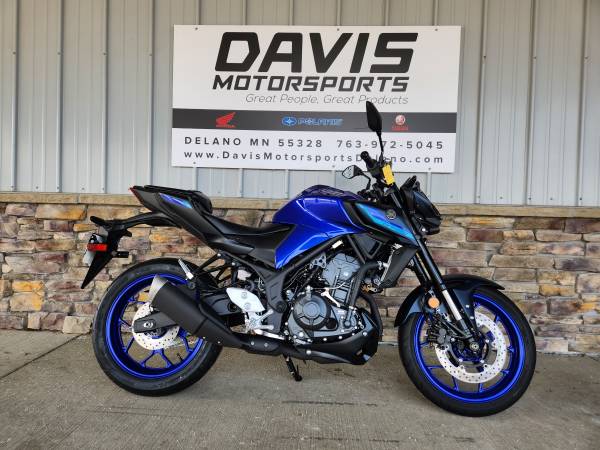 GET YOUR NEW 2025 YAMAHA MT-03 FOR ONLY $ 4,499.00 + $ 600.00 FREIGHT + $ 350.00 YAMAHA SURCHARGE NOW AT DAVIS MOTORSPORTS IN DELANO. SAVE $ 500.00!! MSRP on this bike, Model # MT03SL is a mere $ 4,999.00 + $ 600.00 freight + $ 350.00 Yamaha surcharge. When you are looking for a top-of-the-line performer in a small-bore naked street bike, the Yamaha MT-03 is the clear answer! This little giant is loaded with big bike features and excellent performance at an affordable price. This 321cc liquid-cooled two-cylinder engine features lightweight forged pistons and carburized connecting rods, delivering easy to manage power in the low rpm range with strong high rpm power. The Assist & Slipper Clutch provides an extremely light clutch feel making the MT-03 even more fun in the city, while its offset cylinders and advanced fuel injection system ensures smooth throttle response. A smooth-shifting six-speed gearbox ensures the rider always has the right ratio, whether riding through tight city streets or on the open highway. The MT-03 features a 37mm inverted KYB® fork with optimized spring and damping settings, delivering more solid handling when compared to motorcycles using conventional front forks. The seven-step preload adjustable single-shock design is tuned to strike a balance between ride comfort and sporty performance with capability across a wide range of uses, from urban commuting to extended rides into the twisty canyons. The 298mm floating-mount front disc brake ensures excellent stopping power, supported by a 220mm rear disc. The ABS system features anti-lock braking system to boost rider confidence and prevent wheel lock-ups in reduced-traction conditions. The 2025 MT-03 now features Yamaha Motorcycle Connect (Y-Connect) smartphone connectivity which works in conjunction with the free-of-charge Y-Connect app (available for iOS and Android) to enable a direct connection between motorcycle and smartphone. Y-Connect capability for the MT-03 includes the ability to view incoming call, email and message notifications. Additional useful functions include monitoring and notifying the rider or other contact of motorcycle technical issues, and also the ability to track and record key motorcycle ride data within the app, including distance covered, fuel consumption, acceleration, motorcycle location and much more. An LCD instrument cluster now displays connected smartphone information along with vital vehicle data. There is also a USB-A socket located next to the display providing convenient power for phone charging or heated gear. The dynamic MT-03 looks cool with its dual angled position lights that emphasize its aggressive big-bike looks. A single compact and powerful LED headlight burns a hole through the darkness to light up the road ahead. Updated styling for the 2025 MT-03 includes a tail section with a taillight design, along with subtle refinements to the front-end exterior design bringing a more unified look with its MT-series siblings. great finance options available on approved credit. Prices do not reflect applicable freight, tax, and license fees. All rebates to dealer. get your Yamaha at Davis Motorsports in Delano or call us at 763.972.5045 if you have questions. ducati kawasaki honda triumph ktm