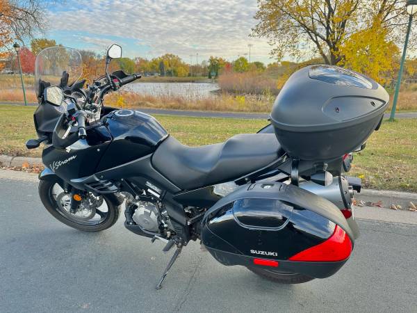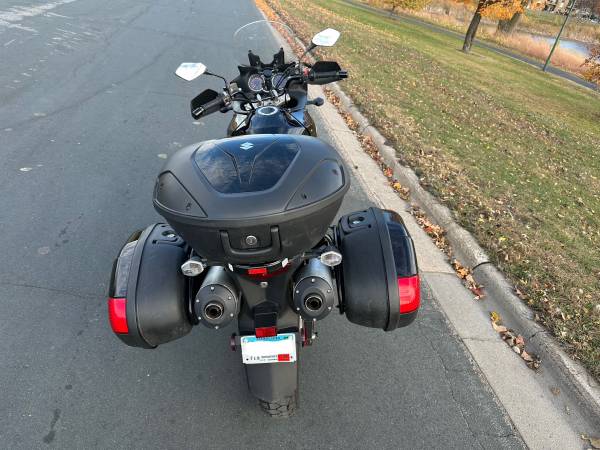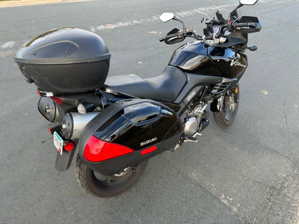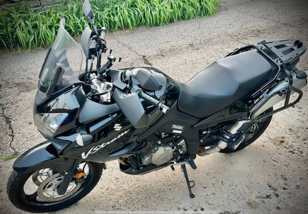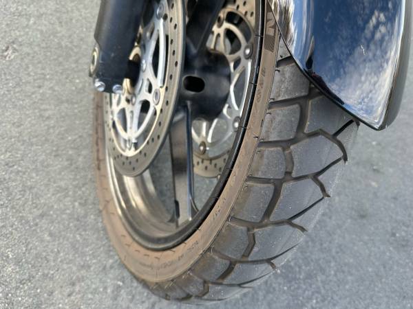 Never dropped, almost completely stock includes factory locking side cases and RAM mount and Apple lightening charging cable ready to charge. It also has the big factory top case which will fit a helmet and more, but I’ve mostly kept the 3 cases stored. Rubber is a couple years old with no chicken strips as I’m in my mid 60’s with a 3rd spinal procedure coming soon. Grips, hand guards, foot pegs, exhaust and wind shield all factory. I put on sport mirrors as the bigger ping pong paddles vibrated. (Old mirrors included) *no fuel mods or chipping done*. Idles right at 1K and feels great. No leaks, no smoke. New spark plugs and air filter installed at Blue Cat Motorcycles less than 600 miles ago ..