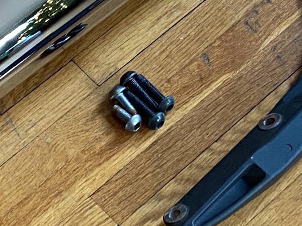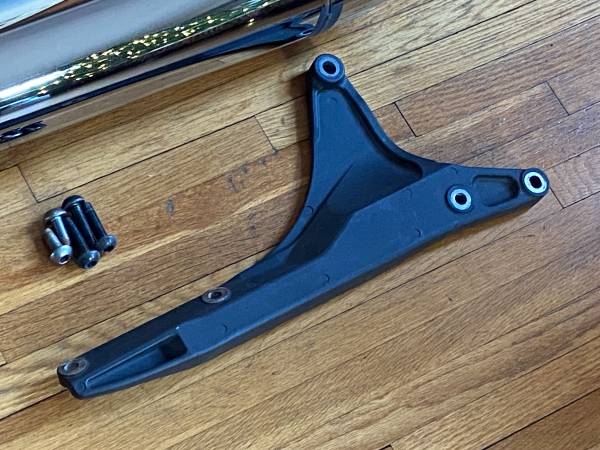 mounting bracket, 2 bolts to mount pipe to bracket, 3 bolts to mount bracket to bike, clamp to hold muffler to pipe