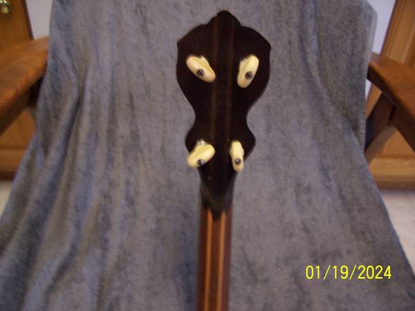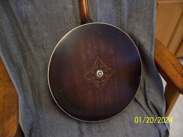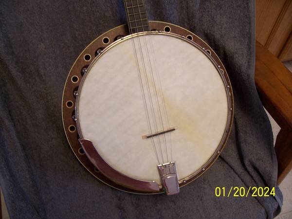 Harmony tenor Banjo made from Walnut from the 1920's or 1930's is my best guess on the age . It is a tenor and it is really nice with the very fancy all wood resonator. and a lot of inlay work. It is a totally playable ready to play banjo. It features natural walnut wood with a Lacquer finish. It is a nice complete Banjo ready for you to tune it up and play. I think it is completely original. Terms are cash and I am in the Alexandria area.
