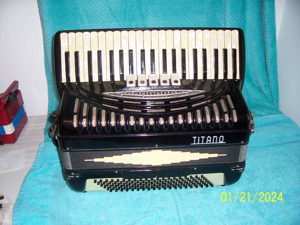 Titano Standard 3 treble 4 bass reeds Black accordion. It has 18 3/4" keys and weighs about 20 lbs. This one sounds really great. This is a Good working unit. This has very good compression 20 + seconds in a hang test and plays great. We went thru every function every reed bank every note and it works great. It has a wonderful sounding close musette to my ears. Ready to play it comes with some used straps and the original well used case.