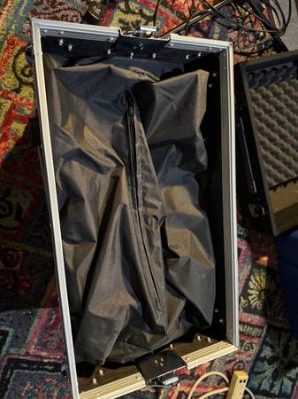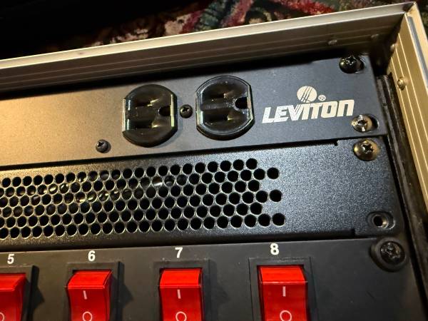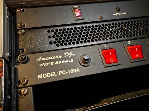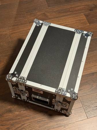 This is an OSP shallow 6U rack in great condition. The rack alone is worth the price, but I am adding some things that I want to get rid of; a Leviton power supply, an American DJ power unit with 8 switchable outlets, a single-space vented plate, and two rack shelves. Both lids include zipper storage compartments.