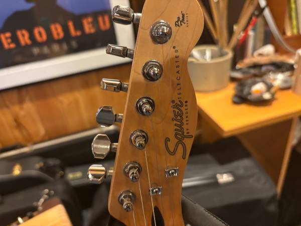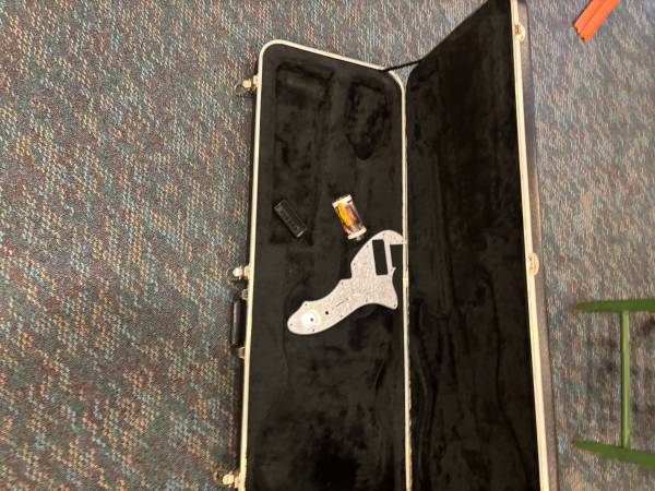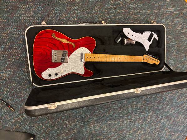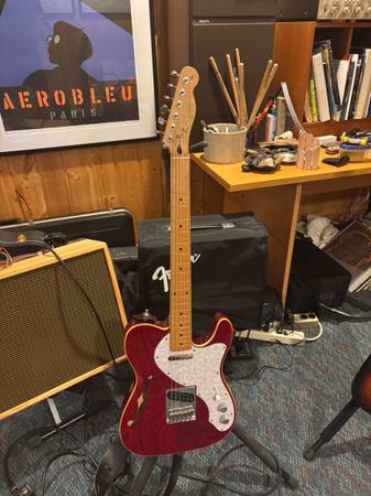 This is a really nice Squier Pro Tone Telecaster Thinline in stunning Crimson Red Transparent finish. Maple Neck, Semi-Hollow Ash body. What a great guitar for blues, rock-a-billy or classic rock! These were only made for about three years so there aren’t many around. Also has an extra pick guard and P-90 pickup for other tones! Comes with Fender HSC