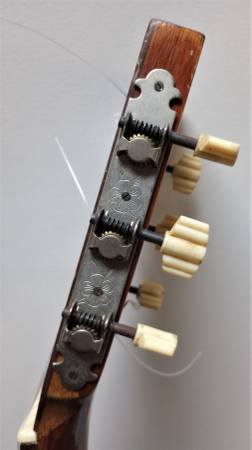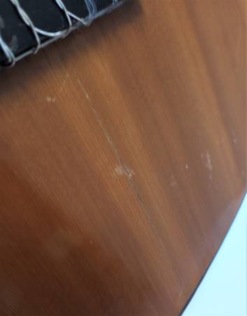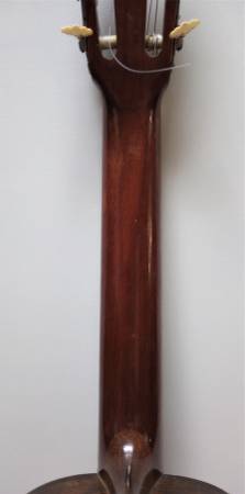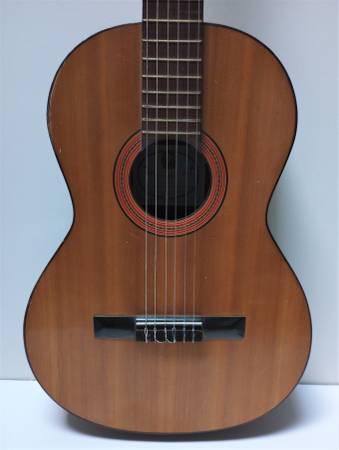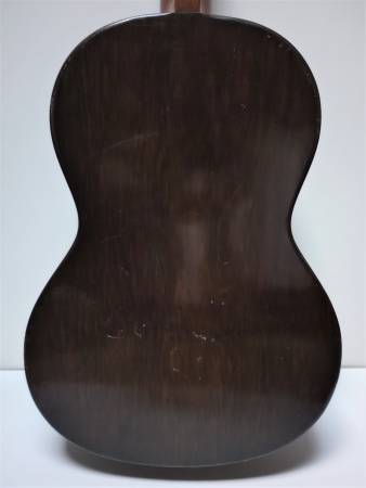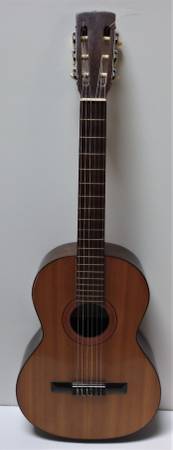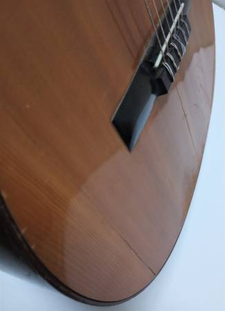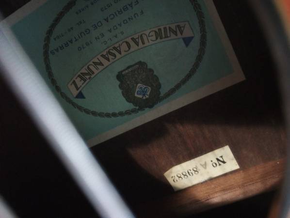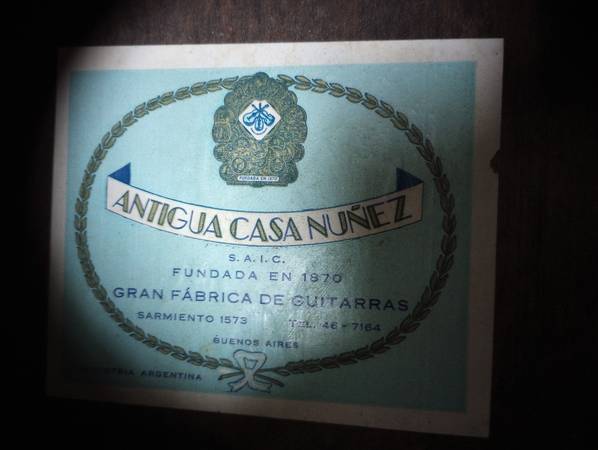 Antigua Casa Nunez Model A-1 with case. Made in Argentina by the well-crafted and regarded guitar makers of the House of Nunez. This model comes from approximately the 1960's (based on label design). The Model A-1 I have seen listed as their "Medio Concierto". Top has a couple of repaired cracks. Full size nut (52mm) and 25.5" (642mm) string length.