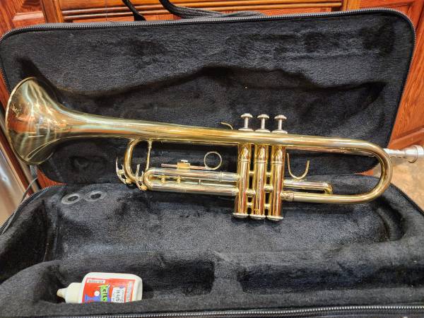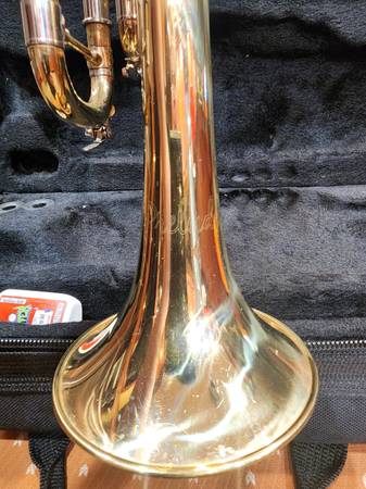 Conn/Selmer Prelude/TR711 Bb intermediate-level trumpet made by Conn-Selmer, the same company that makes the Bach Stradivarius trumpet. Gold lacquer finish is in excellent shape except for an extremely tiny area of finish wear on the bell under where the brace is soldered on (that you won't see when the horn is played); there are no scuffs or scrapes. This trumpet looks spectacular under the bright lights. Trumpet has a red brass leadpipe to help with proper "note-slotting" and a yellow brass bell to help give it a very warm sound. There are no dents, only a small ding at the bottom of the second valve side from hitting a music stand; you have to be holding the trumpet to see it. This trumpet is as close to showroom new as you can get. There is absolutely nothing that affects the playability of this trumpet.