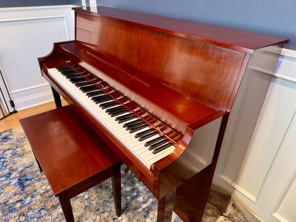 -Condition: Excellent overall. Cabinet shows only minor blemishes (small indentation on fallboard lip, tiny ding on key rail, light surface scratches on bench). Keys and action in excellent shape; one white key has a tiny chip. Pedals slightly tarnished but fully functional.