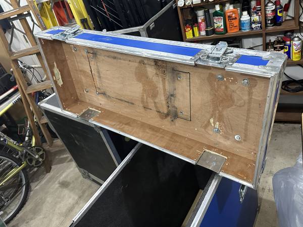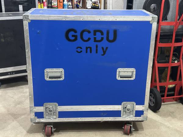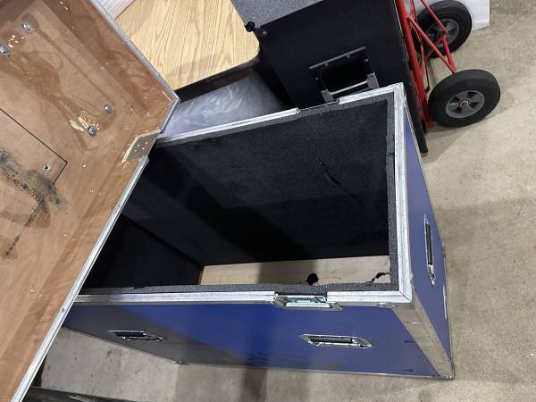 Heavy duty wheeled anvil style rolling road case. Interior is lined on all 4 sides with sturdy foam lining. Outside dimensions: 41 x 17.5, x 43.5" tall. Great for Marshall guitar amp speaker cabinet, video monitor, or other uses, etc. Multi purpose.
