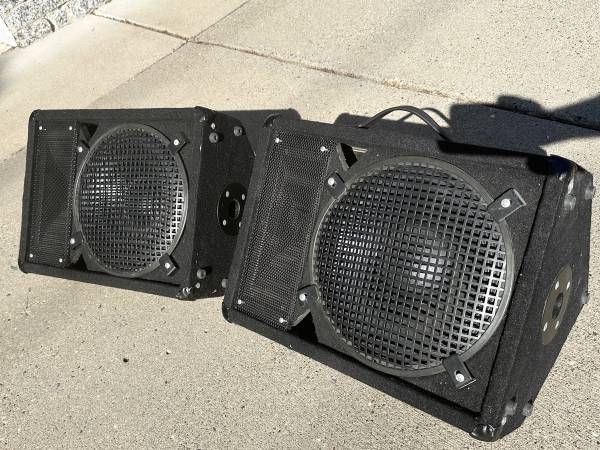 Floor monitor set for P.A. with large 12" inch speakers. Full range. Has easy carry handles, & proper brackets for F.O.H. pole mounts. EXCELLENT condition. You can take these today.