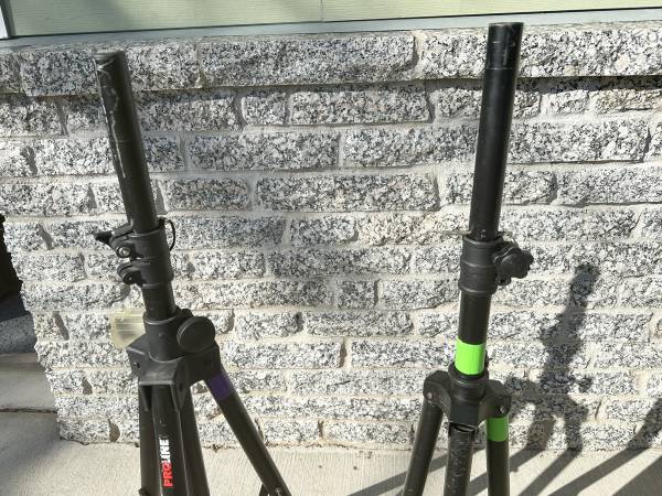Two good quality adjustable aluminum speaker stands. Great for band, DJ, Karaoke, etc. Fully functional. Good used condition.