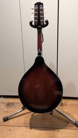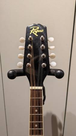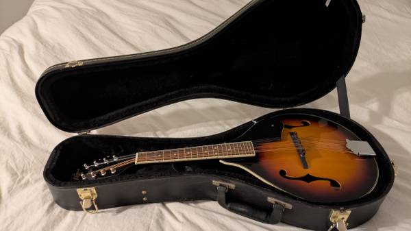 Rouge Mandolin, model RM-100A I believe. Instrument is in great condition with minimal play wear. Sunburst finish. Includes hard shell case. Case covering is coming off in one area, but case and latches are sturdy and protect the instrument well. Great beginner model.