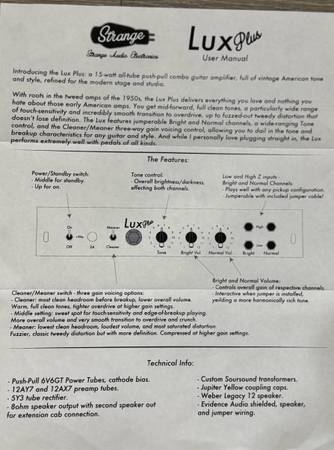 Like new Strange Audio Lux Plus in Blackout finish. Number 22. This is a great sounding amp. Lists new for $2400. Specitications: • 15 watt Push-Pull Class AB amplifier based on classic American...