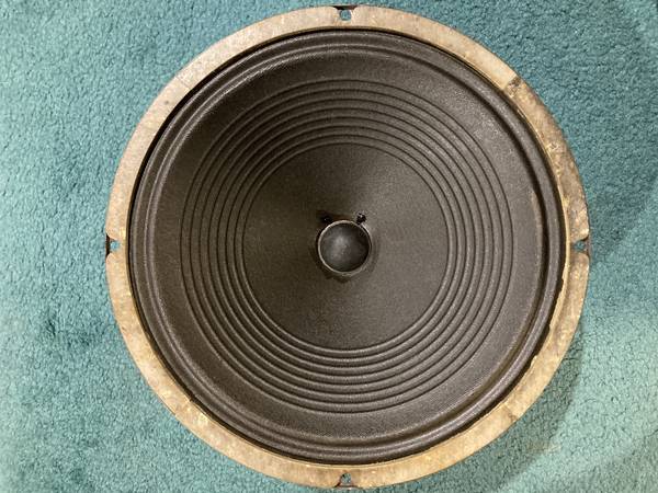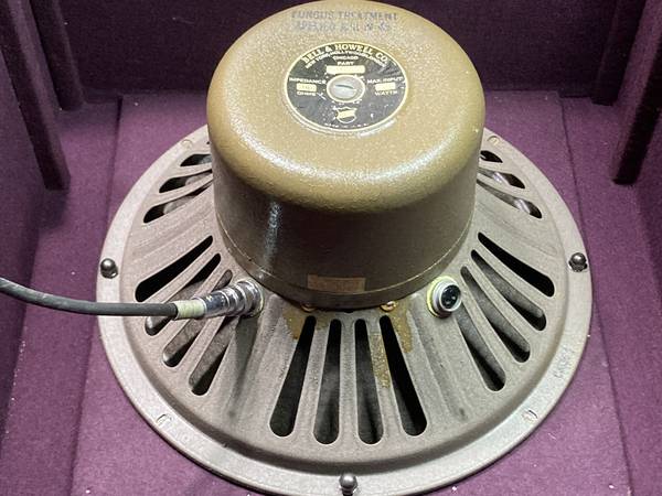 This Jensen-equipped Bell & Howell Filmosound speaker has a stamp that reads "FUNGUS TREATMENT APPLIED APR 1945". My best guess is it was used to play movies for U.S. troops in the humid South Pacific, hence the extra treatment. Well it worked, and the original cone is still in perfect condition (check out the closeup pics; it looks like new!). 16 ohms, conservatively rated for 25 watts. The speaker doesn't sound tired like some older Jensens; it has plenty of presence and solid low end. Really barks when you hit it hard, lots of distortion harmonics and twang when desired, but also does that vintage smokey jazz thing extremely well. This would also KILL for blowing harp!