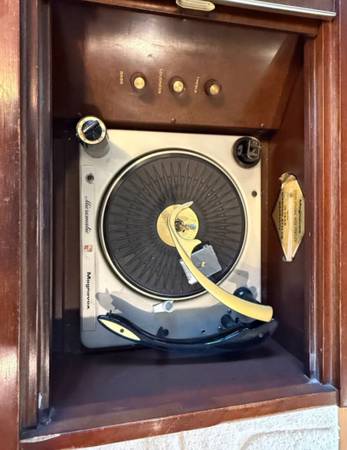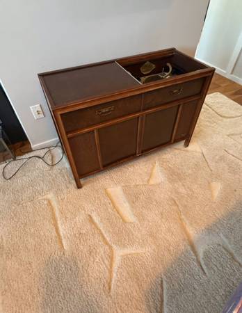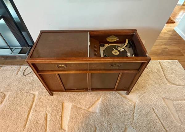 Vintage (fully functional) record player 39” W x 26” H x 17”D. Overall good condition with some wear in wood, consistent with age