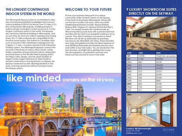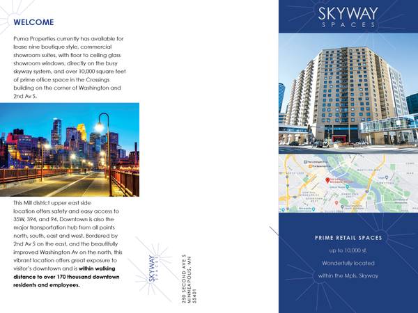 This is a gross lease on one of our most attractive skyway retail spaces. Suite 280A offers an open showroom / office floor plan, beautiful lighted display windows on the busy skyway, commercial grade white marble tile, fresh paint, skyway signage, full view double entry door and 25ft of frontage directly on busy skyway. Your monthly payment each month covers all expenses.