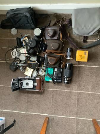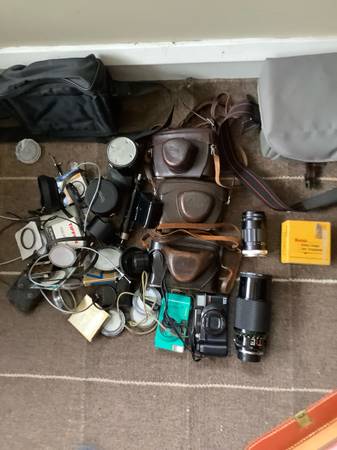 I have a bunch of used film camera gear I’d like to clear out. But it’s mostly oddball stuff: filters, Leica camera cases, telephoto and zoom lenses, untested point and shoots, and other ephemera. The land camera likely needs service. I’m selling this stuff as a lot—would prefer not to part out. Everything pictured in the photos is included. $40 takes it away.