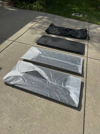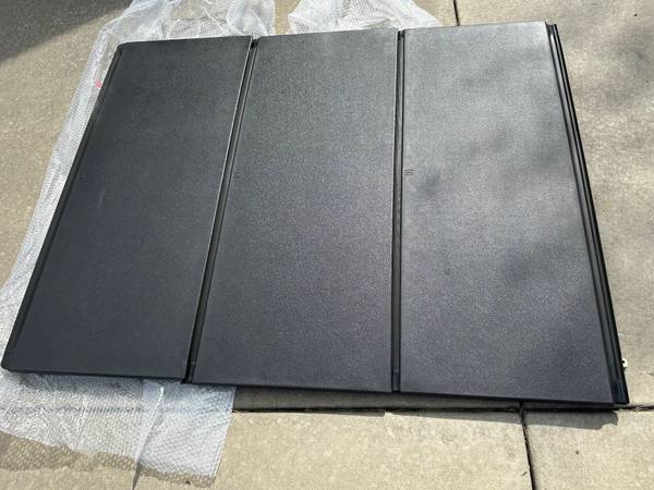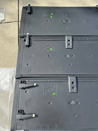Selling set of OEM tonneau covers (3) compatible with 2003+ Cadillac Escalade EXT, Chevy Avalanche 1500/2500. Covers have been in storage for the past 20 years. Also includes tonneau cover storage bag, also unused. Note: covers seem to show a slight upward curve (see pix).