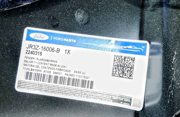 New original Ford Mustang LH - driver's - front fender. NOT A CHINESE PIECE OF TIN. THIS IS FROM FORD AND WILL FIT. Primed. Has light scuffing in primer from sliding around in the box.