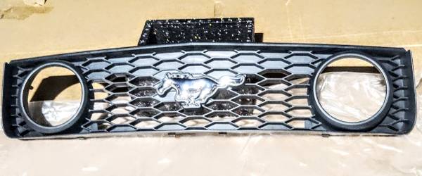 2005 - 2009 MUSTANG GRILLE W/CHROME PONY - GT - BULLITT - CALIFORNIA SPECIAL - ORIGINAL FORD - NEW IN ORIGINAL FORD BOX. Matte black with a chrome pony. Has the holes for your fog/driving lights.