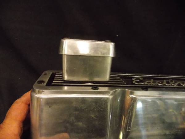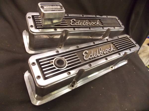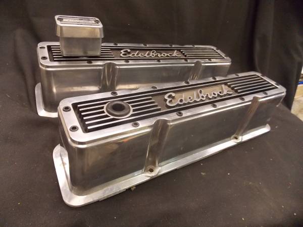 Great Shape Finned Top with Edelbrock Name Cast into it. Polished Alum with one Factory Edelbrock Breather and rubber grommet in other one (oil deflectors under them both--very important ). Fits you Small Block Chevrolet Engine 283 302 305 327 350 383 400 cubic inch Motor years 1959 thru 1986 for a cool Nostalgic Look. Elite Model 4249 have simulated Allen bolted down Top Portion (Just simulated) These are Late 1960' and 1970's models. Call (952)854-5 seven eight six