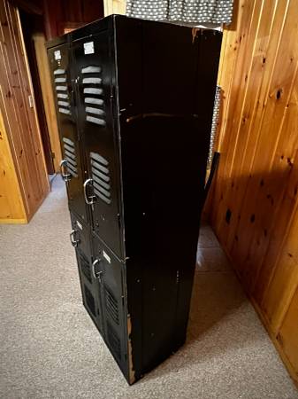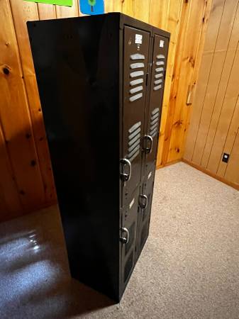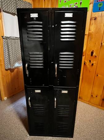 4 door black school locker One side is wood panel 60" tall, 24" wide, 15" deep