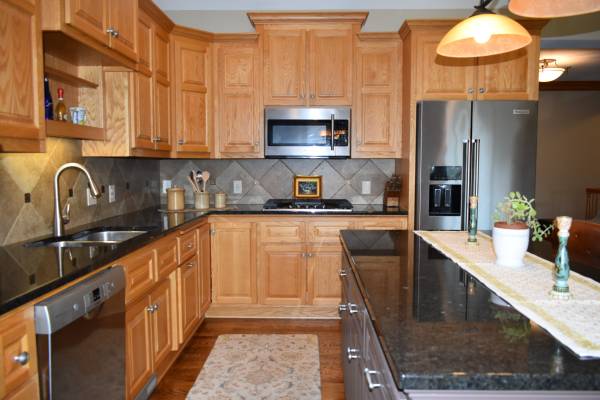• Kitchen features neutral granite counters and breakfast bar/island, ample upgraded oak cabinetry, built-in TV, and all-replaced stainless steel Bosch and Kitchen Aid appliances (latest in 2024).