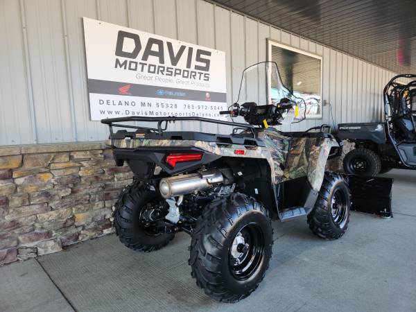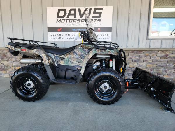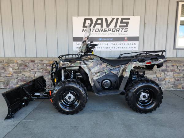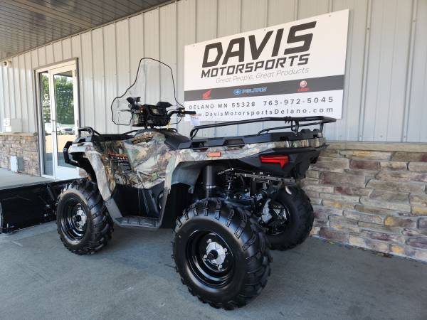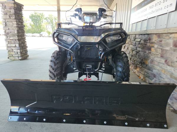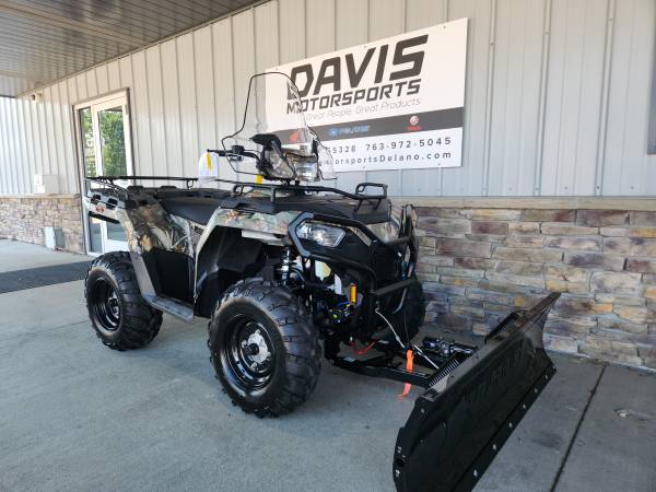 GET YOUR NEW 2025 POLARIS SPORTSMAN 570 WITH POWER STEERING SUPER TOUGH CAMO FINISH AND PREMIUM WINTER PLOW PACKAGE FOR $ 11,249.00 AT DAVIS MOTORSPORTS IN DELANO. NO FREIGHT OR SET UP CHARGES! SAVE $ 2,800.00 NOW! BE READY FOR EVERY SEASON!! MSRP on this ATV as equipped is $ 13,499.00 + $ 595.00 freight. This Sportsman is equipped with our premium winter snowplow package that includes a 2,500 lb. Polaris winch, Polaris Glacier Pro Plow with 60" steel blade, Polaris blade angle control system, (never have to get off machine to adjust blade) hand and thumb warmers, and a tall Polaris windshield all installed by our Polaris certified technicians, so you know it's right! You also get super tough camo finish and power steering on this Sportsman!! The most trusted ATV in the industry just got better. The Sportsman 570 has greater smoothness, strength and versatility than ever before, and all coupled with a bold design and our legendary ride & handling. Polaris electric power steering takes the work out of all day riding. Less fatigue on rough terrain for more fun in the saddle! Great features include; a relocated battery with 78% more old cranking amps than before, all sealed suspension bushings, towing capacity improved to 1,350 LB., 6 ply 25" tires, ground clearance increased to 11.5", triple 50 watt halogen headlamps, updated front and rear storage racks for more versatility and convenience, a steel front rack extender, and Sportsmans' are now pre wired for a winch and for hand and thumb warmers. All wrapped in bold looks. Underneath the aggressive look, you’ll still find the heart and soul of a Sportsman. The Sportsman 570 still has all the great elements that made it what it is, a Prostar 44 HP fuel injected liquid cooled motor, Polaris CVT transmission with low range and park, Polaris true one touch ON DEMAND all wheel drive, full digital instrumentation, and Polaris' 4 wheel independent suspension. Check it out and see why this is a number 1 seller! Great finance options on approved credit. Prices do not reflect applicable freight, tax, and license fees. All rebates to dealer. See the Polaris line up at Davis Motorsports in Delano, or call us at 763.972.5045 if you have questions.