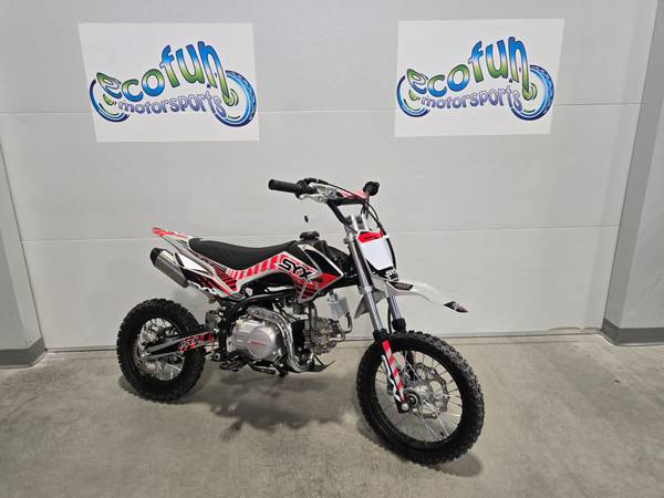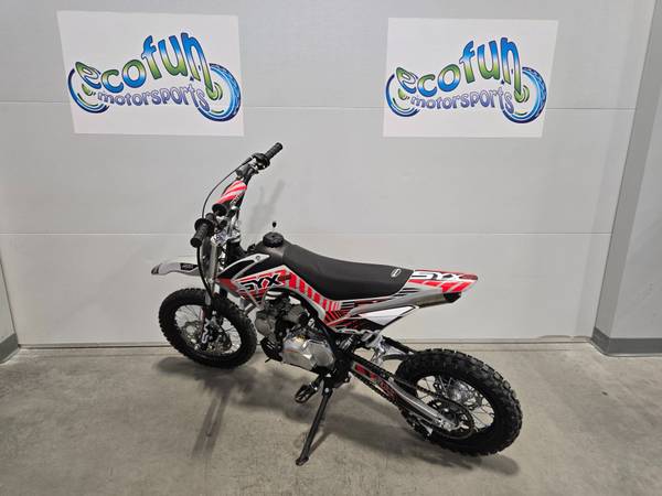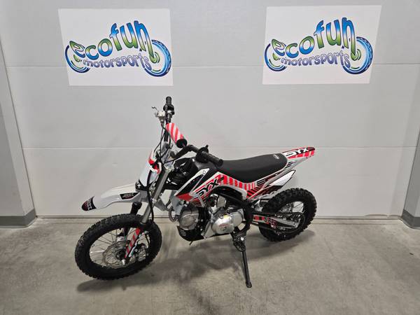 These great looking, 125cc dirt bikes are the perfect dirt bike for some outdoor fun. Approximately 30mph top speed, electric start, automatic transmission, hydraulic brakes, and knobby tires make these great for off-roading with the kids or cruising in the pits at the track. Come take a look at one today.