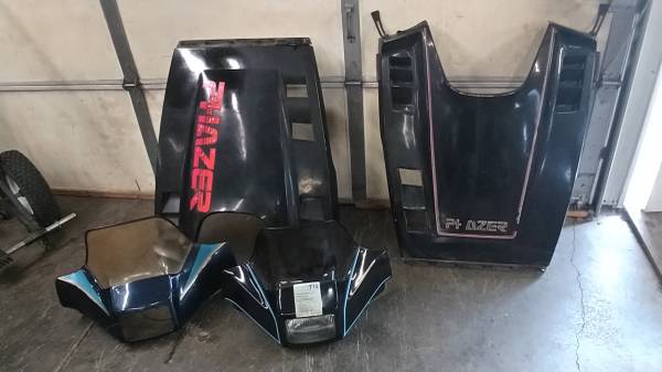 many phazer parts-gas tanks,air box ,rear bumper,fan intake , oil inj. bottle $15 bumpers with hitches $45, fairings black, white, blue $60 to $95 hoods $75-$125 black-blue 84-89 phazer strut cover...
