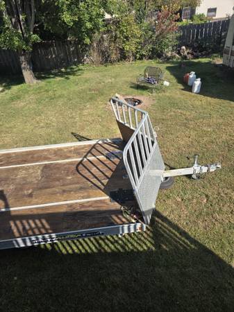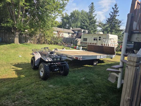 2021 Aluma double snowmobile trailer, I had 8 d-ring tie downs professionally done and a salt shield/ ramps. Also has 2 removable Motorcycle chocks.3500 . Also 1995 Yamaha 350 big bear 4-wheeler ,1000 miles, with winch, very clean with title,1500. I'll throw in a Eskimo quick flip 3 fish house also.