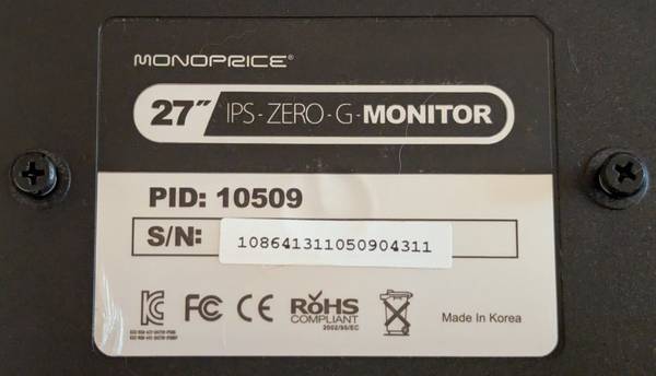 Monoprice 27" IPS Zero G 1440p Monitor, Very good condition, unused for several years, 2560x1440 60Hz, VGA and DVI inputs. See https://downloads.monoprice.com/files/manuals/10509_Manual_130426.pdf