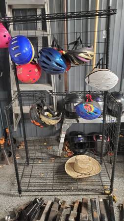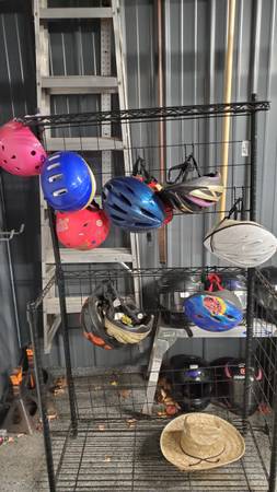 Bicycle helmets $3.00 each Sports equipment rack $15.00 Reply with your phone number for me to call you. No number no reply Thank you