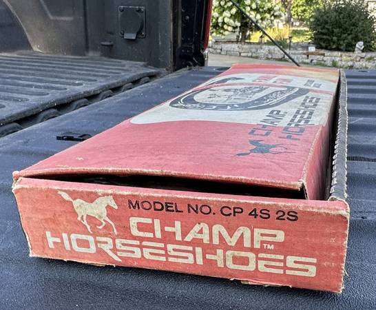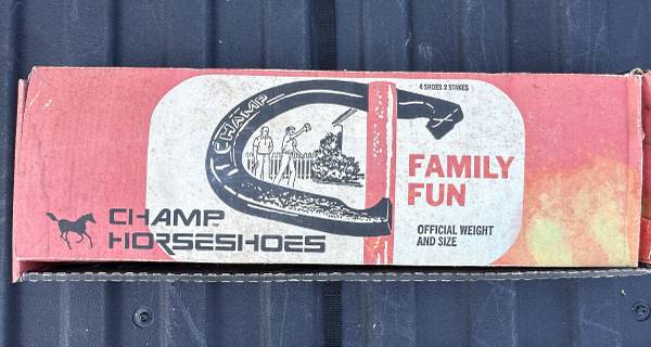 Top quality vintage regulation horse shoes gaming set with stakes. Champ USA - Steel horseshoe throwing family lawn game in original box. Complete; Ready to play & enjoy. You can take this today.