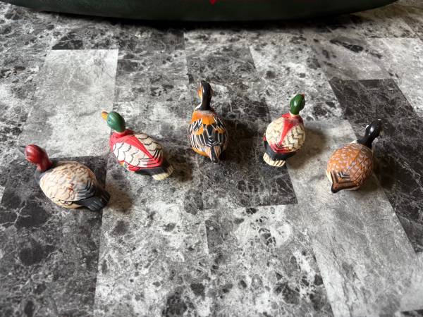 Add charm to your shelf or curio cabinet with this delightful set of five miniature ducks, each carefully hand-painted and full of character. These collectible waterfowl are made by Enesco and measure approximately 3” long and just under 1.5” tall—perfect for decorating or gifting.