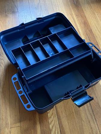 Flambeau Outdoors Tacklebox with folding tray and removable boxes with customizable dividers Eagle Claw Long Nose Pliers 6" new in package pair of scissors box is black despite looking blue in some...