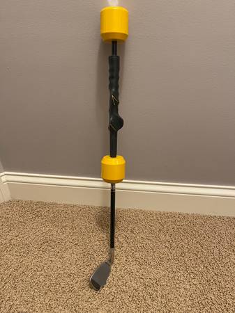 Right hand golf swing aid with training grip, dual weights and iron head. This is for strength/stretch improvement and not a golf club for hitting golf balls. Shorter than a regular golf club - made for strengthening and stretching your muscles.