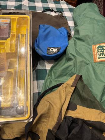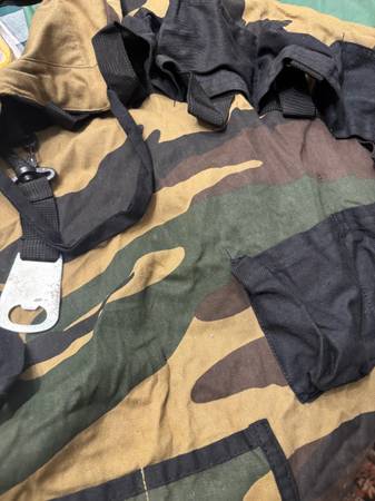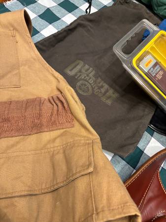 Gun holster and belt beautiful vintage medium size , holster is model 77r -60 1. The belt is model 78-22 medium they are made in Portland Oregon by George Lawrence Immaculately detailed New Condition. Including large game vest, camo cooking apron , outer gun cleaning kit , Waterproof backpack cover REI , Duluth Trading carry bag , outdoor Research small bag all one price. A great deal downsizing…. show contact info