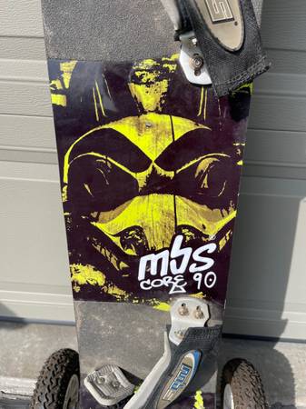 Hardly any use and this skateboard is in great shape. Comes complete with bindings, trucks and off-road 220x50 tires. Ideal for land kiteboarding or hitting downhill grass slopes and hills. Deck is made from a flexible material to help with jumping and landing. Not in a hurry to sell. Price is firm.