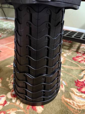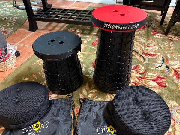 Two portable stools, goes up to 2 feet tall, is flexible with height, comes with a padded seat, a bag that could also be used as a backpack carrier, excellent when you need a portable seat to sit on, such as camping, put in your car trunk, walking in the park and need to sit down right away going through an art gallery extra seating for a barbecue, the weight capacity holds up to 400 pounds, lightweight to carry but heavy duty to sit on. Two brand new stools that fold up and down. Excellent for walking at the state fair and you need to sit down right away, lightweight, and can carry on your back anywhere. Sometimes you go to a bar or concert and there’s no more seating. You just pop up your stool and you’re ready to go.each for $30