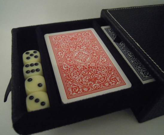 2 Drawer Box with 2 sets of playing cards (sealed) and dice and rules book. New, unused.