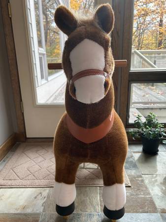 Pony Cycle - a ridable toy pony that rides like a real pony and lets your child exercise. Designed for ages 4 to 7 years. Made of alloy steel and plush. Can be used indoors and outdoors.