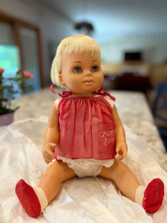 For a collector: cleaned out closets and found my vintage 1961 Mattel Chatty Baby doll. Hair, face, body in excellent and clean condition. You can still pull her string to “chat”: she chats but speech is unclear. All clothes intact and in nice unplayed-with condition with some fading. Hair is perfect. Eyes open and close. $60 CASH. Will meet at Plymouth Cub Foods on Vicksburg Lane.