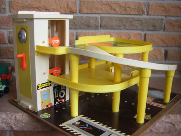 1970 Fisher Price Service Center elevator and car lift work perfectly 4 cars with 4 little people great condition