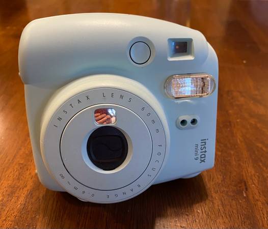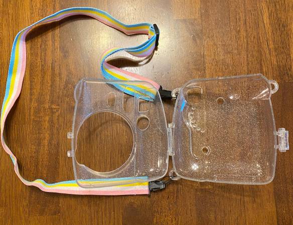 Instax Mini 9 with protective crystal camera case and adjustable rainbow shoulder strap. Includes 4 boxes of film.