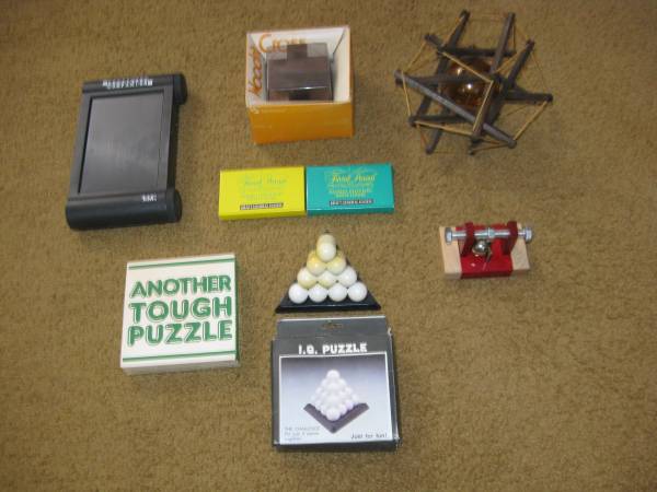 Fine set of material for the puzzle/trivia fan! The Crossword Companion is a working unit complete with storage drawer and pencil sharpener. (Refill puzzles can be purchased online.) The two Trivial Pursuit mini-games are designed for players ages 8 and up. Each game contains 10 game cards for adults, 10 game cards for children, one die, and two scorecards. Both of the mini-games have never been opened. Next is the Woodn't Cross from 1974. Can you get the cross apart and put it back together again? The Bolted Closed puzzle is simple. Remove the ball from an impenetrable lair. The IQ Puzzle is spectacularly simple - construct the tetrahedron like figure from only four pieces. The goal of Another Tough Puzzle is to construct a honeycomb figure from the seven pieces with the understanding that their are thousands of incorrect combinations. Finally, the allure of the spider's web. Can you extract the ball from its clutches? All eight items for one low price! Now is not the time to play around! Take care of the puzzle fanatic in your family and act now!