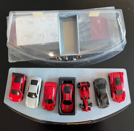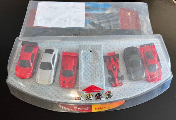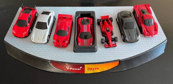 This Shell V-Power Promo Ferrari Car Display Case is a must-have for any Ferrari enthusiast. It comes with a collection of 7 Ferrari cars, 2 of which have been used and 5 of which are unplayed. The cars are made in a 1:38 scale and feature various vehicle years, all united by the iconic Ferrari brand.