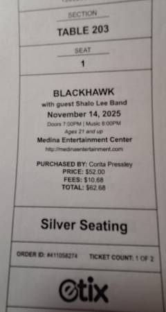 Two tickets to see BLACKHAWK at the Medina Entertainment Center on 11/14/25 at 7pm.