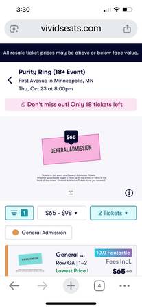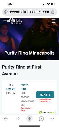Three tickets available for Purity Ring at First Ave Oct. 23. These are selling for $75+ right now. Buy 1, 2 or all 3. 8pm show.