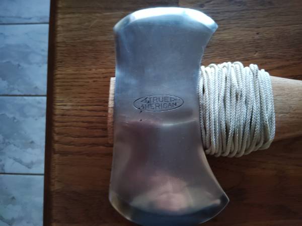 Vintage Axe with New Hickory handle (axe model 32). Tru American axe head. Axe has been cleaned up to remove wear marks. Excellent condition. Twine wrapped around handle to protect handle from breaking if hit incorrectly. The axe is 8 1/2 inches by 4 1/4 inches. The handle is 35 1/2 inches.